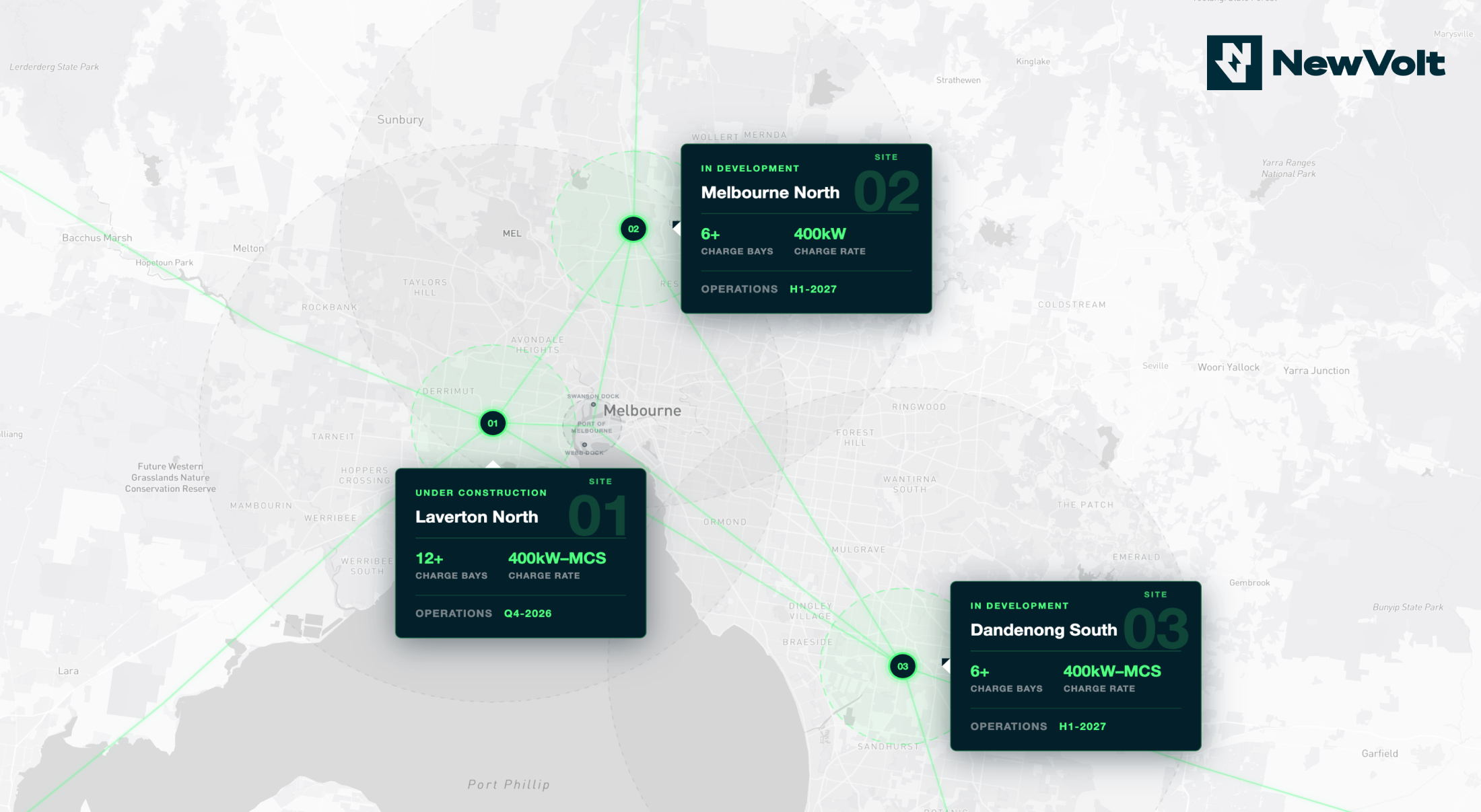 • Stage 1 of the NewVolt Network comprises three open-access, fast-charging hubs in Melbourne’s west (Laverton North), north (Campbellfield/Somerton) and south-east (Dandenong South).